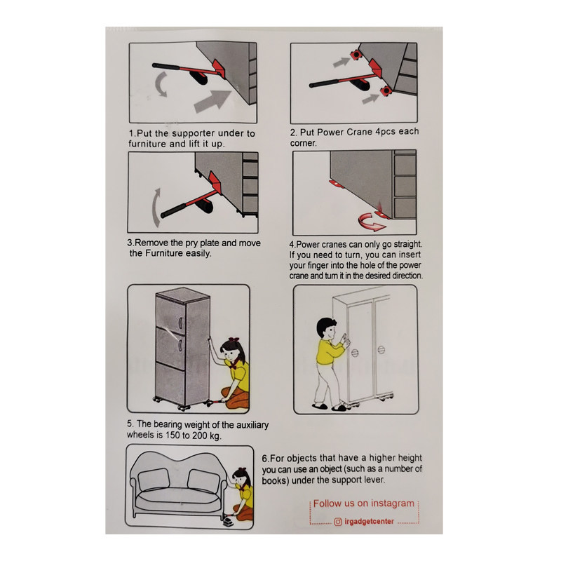 پک کامل شامل ۴ چرغ غلطک دار و یک اهرم محکم قابلیت جابجایی بار تا ۲۰۰ کیلوگرم وزن کامل بسته: ۱.۳ کیلوگرم اهرم مکانیکی ۹۰ درجه ای چرخش ۳۶۰ چرغ غلطکی